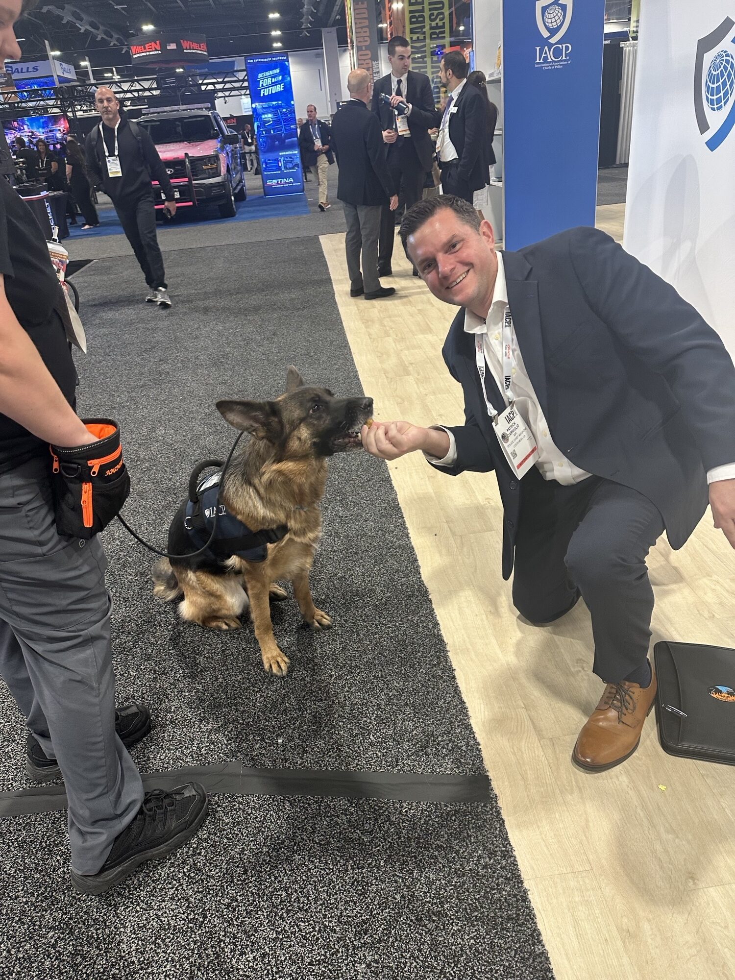 Fox Associates VP Patrick Carriglio spends time with Cris, a young K9 in training at the IACP Annual Conference in Denver.