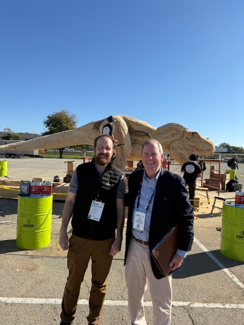 Steve Schwanz with Jim Armstrong, VP/Marketing Director for Aspen Fuels. Aspen sponsored a lumber sculpture event where a T-Rex was created.