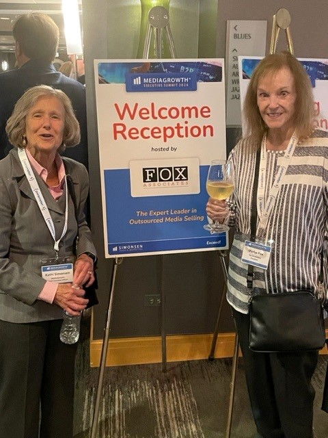 Kathi Simonsen, Founder/CEO of MediaGrowth and Marlys Fox, Fox Associates President/CEO, visit at the 2026 MediaGrowth Summit reception sponsored by Fox Associates in Chicago, April 15-17.